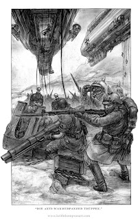 Si notre couple d’ados est dans l’ensemble rien réussis, les personnages de second plan sont pour l’instant moins travaillés. Je pense surtout au conte Volger qui est le bourru de service et surtout au Dr Nora Barlow qui est l’archétype de l’héroïne féminine de roman steampunk. Femme séduisante, intelligente, cultivée, en rébellion contre les conventions de son époque vis-à-vis de la gente féminine, elle est trop parfaite pour être crédible trop longtemps. C’est dommage mais le personnage peut encore évoluer. Parce que mis à part ca, c’est du quasi sans faute. L’ambiance steampunk est une réussite. Si les Clankers et leurs grosses machines sont assez classiques pour ce genre d’histoire, les Darwinistes sont une excellente trouvaille. Même si l’idée d’une baleine flottante gonflée à l’hydrogène ne tiens pas la route une seule seconde sur le plan scientifique, sur le plan graphique c’est une réussite et l’opposition de style entre ces deux technologies si différentes donne lieu à des scènes de batailles inédites et captivantes très bien mise en images par les illustrations de Keith Thompson. D’ailleurs, tout le livre dans son ensemble est captivant. Même si l’issue finale est sans réelle surprise, le rythme faiblis rarement et les différentes péripéties maintiennent l’attention du lecteur à un bon niveau. L’histoire est construite comme une série, un épisode étant constitué de deux chapitres, que l’on prendrait plaisir à retrouver semaine après semaine.