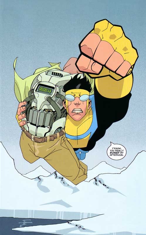Les premiers numéros de la série ne sont pas les plus intéressants. Kirkman n'avait pas encore trouvé le ton juste et on ne sentait pas encore une ligne directrice. Mais tout change à partir de l'issue #7 qui bouleverse complètement la donne et place certains personnages sous un jour nouveau. Alors que le rythme était parfois mollasson, tout s'accélère. Les enjeux apparaissent et Invincible prend de l'épaisseur. Ce changement se manifeste également au niveau du graphisme puisque c'est à peut près à vers numéro également que le comic semble affirmer son style. Un style carré qui fait la part belle aux couleurs vives et aux aplats. Cette identité visuelle forte, qui fait un peu cartoon, peut ne pas plaire à tout le monde, d'autant plus que dans les premiers numéros le trait est encore hésitant mais petit à petit les dessins s'enrichissent en détails, aussi bien dans les personnages que les décors. Ils deviennent plus dynamiques et le comic en même temps qu'il trouve un ton, trouve également un style. Ce n'est sans doute pas étranger au changement de dessinateur, Ryan Ottley remplaçant Cory Walker à partir de l'issue #8.
